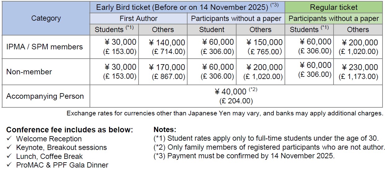 For IPMA members, please request to send your invitation ID and password for registration to spm_conf@spm.or.jp.